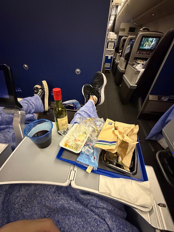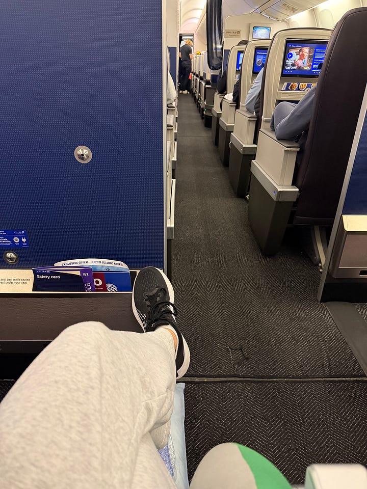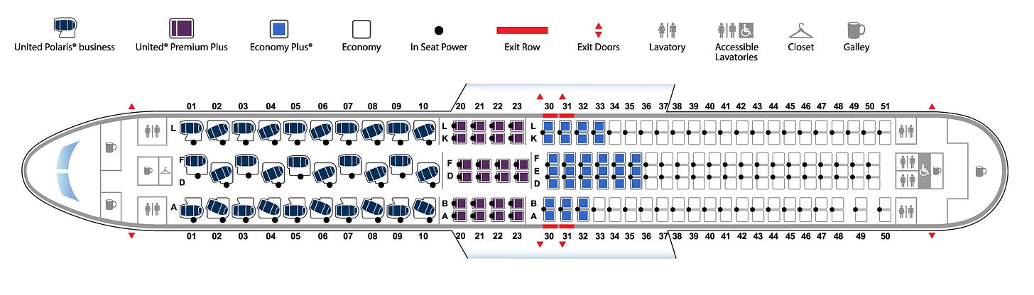 So today, I’m not stuck in a soul-sucking liminal space. I’m riding in fucking style. The limousine of the skies, or at least the Uber Black of the skies: seat 30A on United flight UA129. That’s EconomyPlus to you mortals, which is the third-best section (out of four) on a United long-haul flight.
