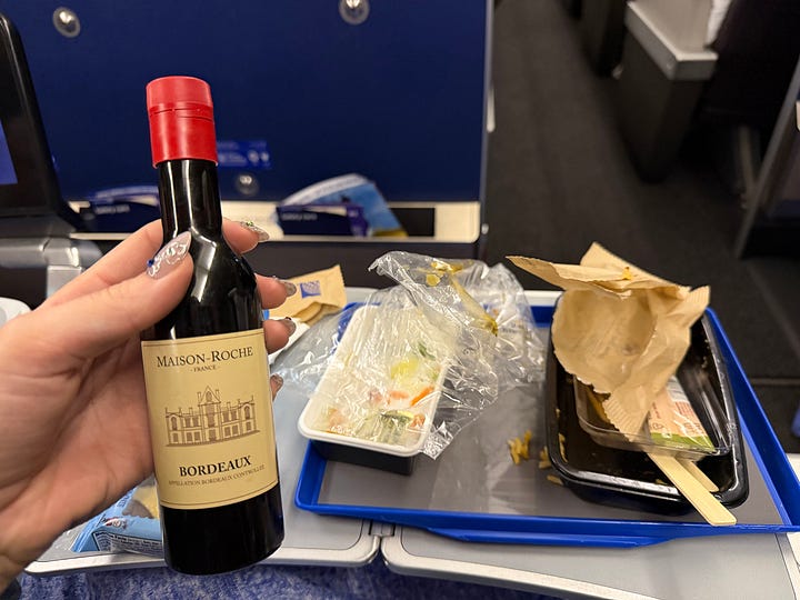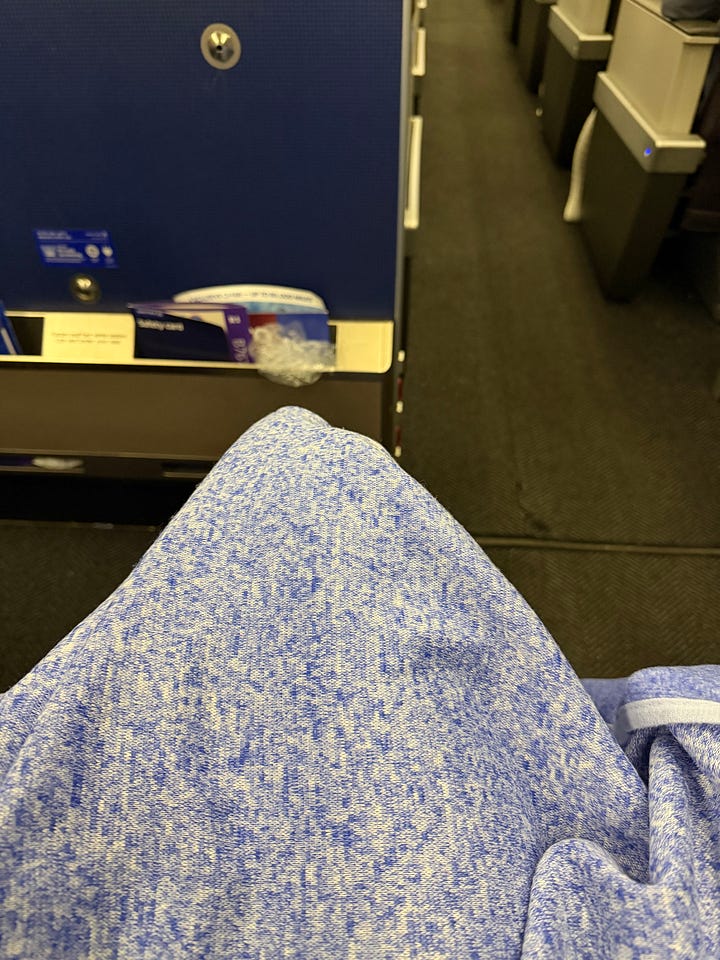 Anyway, airplane blankets have always been top of mind for me since that experience, and I’m pleased to report that United’s blanket is stunning. It has multiple layers, something that I didn’t realize was a luxury until it was taken away from me— one side is a gorgeous knit fabric, and the other side is a soft fleece. Namely, it doesn’t look or feel like a scrap piece of fabric that fell off the sweatshop line at the SHEIN factory and got packaged up for gullible airline customer swine, and to me that’s progress.