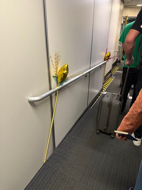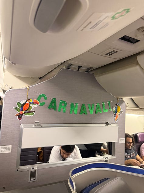 And then I stepped onto the jet bridge and saw that it was decorated, up and down, with Party City Carnaval decorations. A couple cheesy little $5 decorations almost made me melt. Everyone was so excited to go to Rio and celebrate! How festive! How fun! I immediately texted pictures of this to all my friends and family because I was so incredibly charmed by it. An incredible start to my charmed EconomyPlus journey.